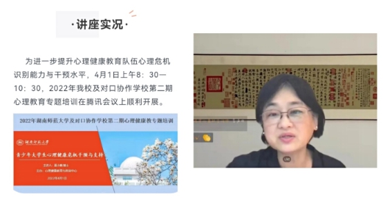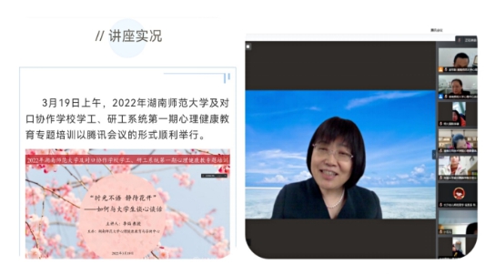 以第十二届“5·25大学生心理健康文化节”活动为契机,开展系列以“时光不语 静待花开”为主题的专题培训。邀请到清华大学心理发展指导中心主任李焰教授和美国麻省理工学院(MIT)心理健康心理咨询中心双专科临床心理学家奚小鹿博士担任主讲嘉宾,为湖南师范大学及对口协作学校吉首大学、湖南应用技术学院、长沙幼儿师范高等专科学校学工、研工系统开展系列主题讲座。