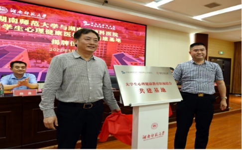 学生工作部(处)部(处)长向发意代表学校致辞。湖南省脑科医院院长周绍明代表湖南省脑科医院发言。校医管办主任周国强与湖南省脑科医院党委副书记陈勇进行现场签约。王辉与周绍明共同为“大学生心理健康教育医校结合共建基地”揭牌。会上还进行了我校2021年心理健康教育工作先进单位颁奖仪式以及“心理健康教育素质拓展培育基地”和“学院特色成长辅导室”授牌仪式。