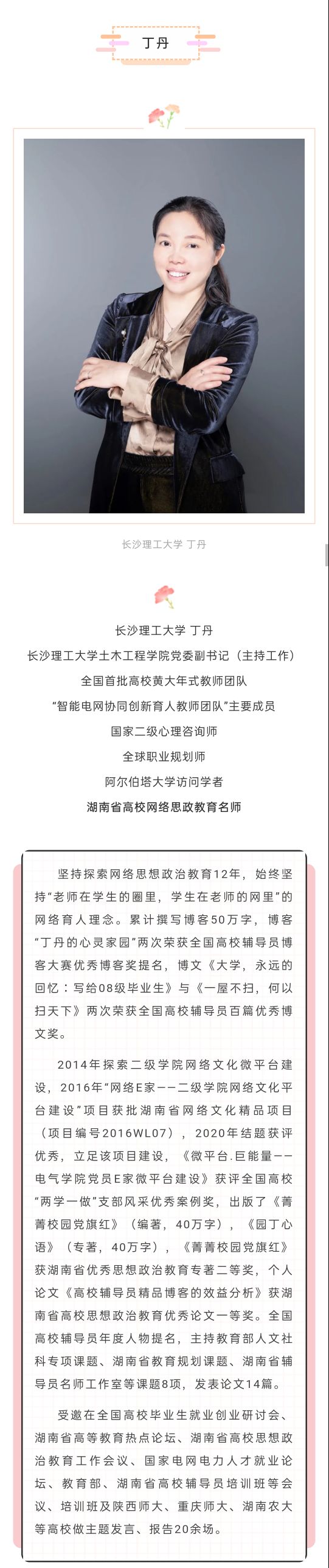 丁丹:长沙理工大学土木工程学院党委副书记、全球职业规划师、国家二级心理咨询师、第一批“湖南省高校网络教育名师培育支持计划”入选者