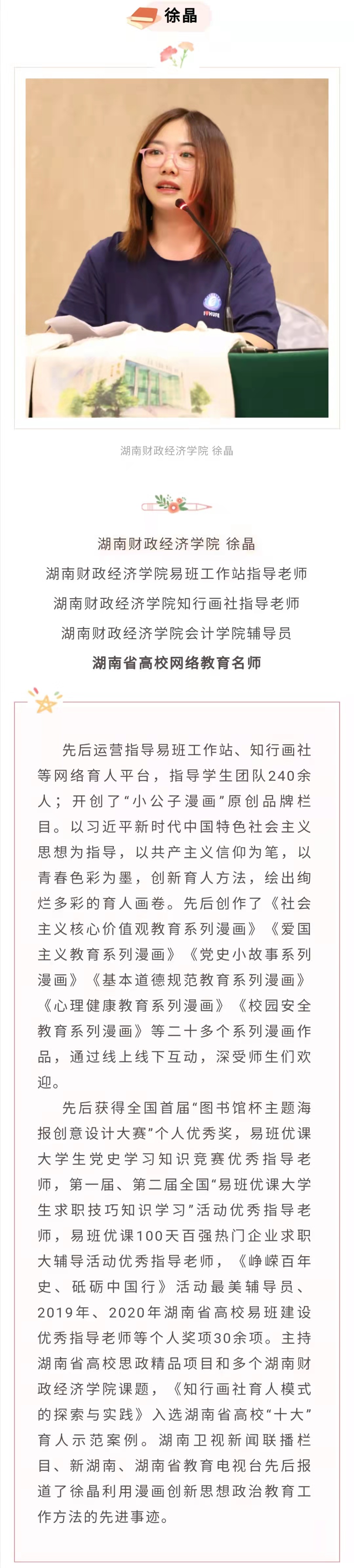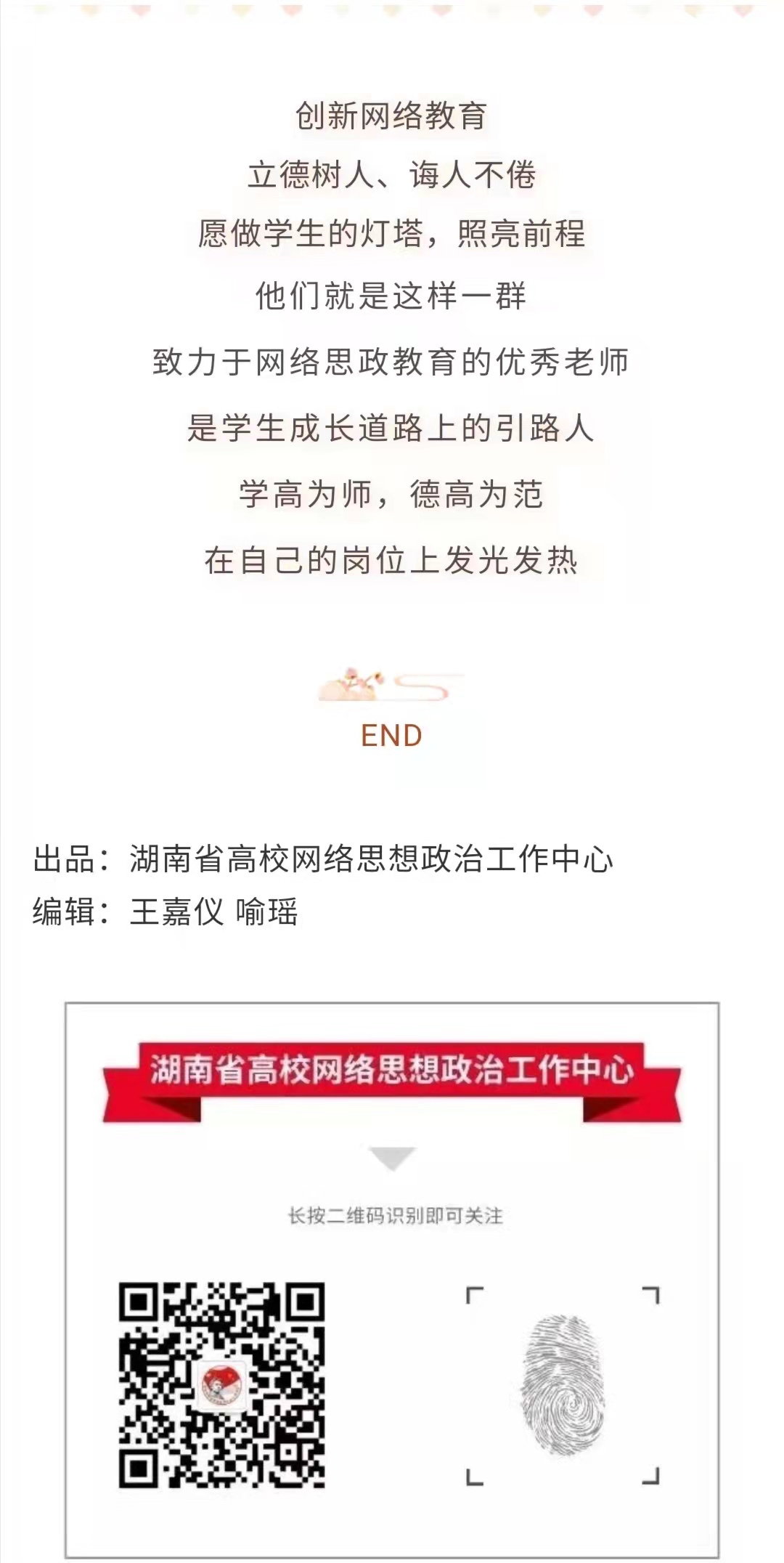 上一条:刘雯:长沙师范学院学前教育学院团总支书、国家三级心理咨询师、高级职业指导师、第二批“湖南省高校网络教育名师培育支持计划”入选者