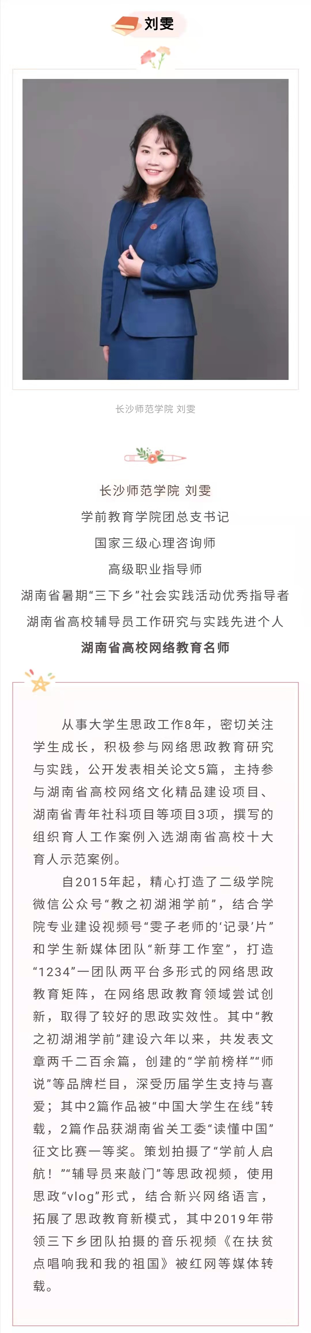 刘雯:长沙师范学院学前教育学院团总支书、国家三级心理咨询师、高级职业指导师、第二批“湖南省高校网络教育名师培育支持计划”入选者