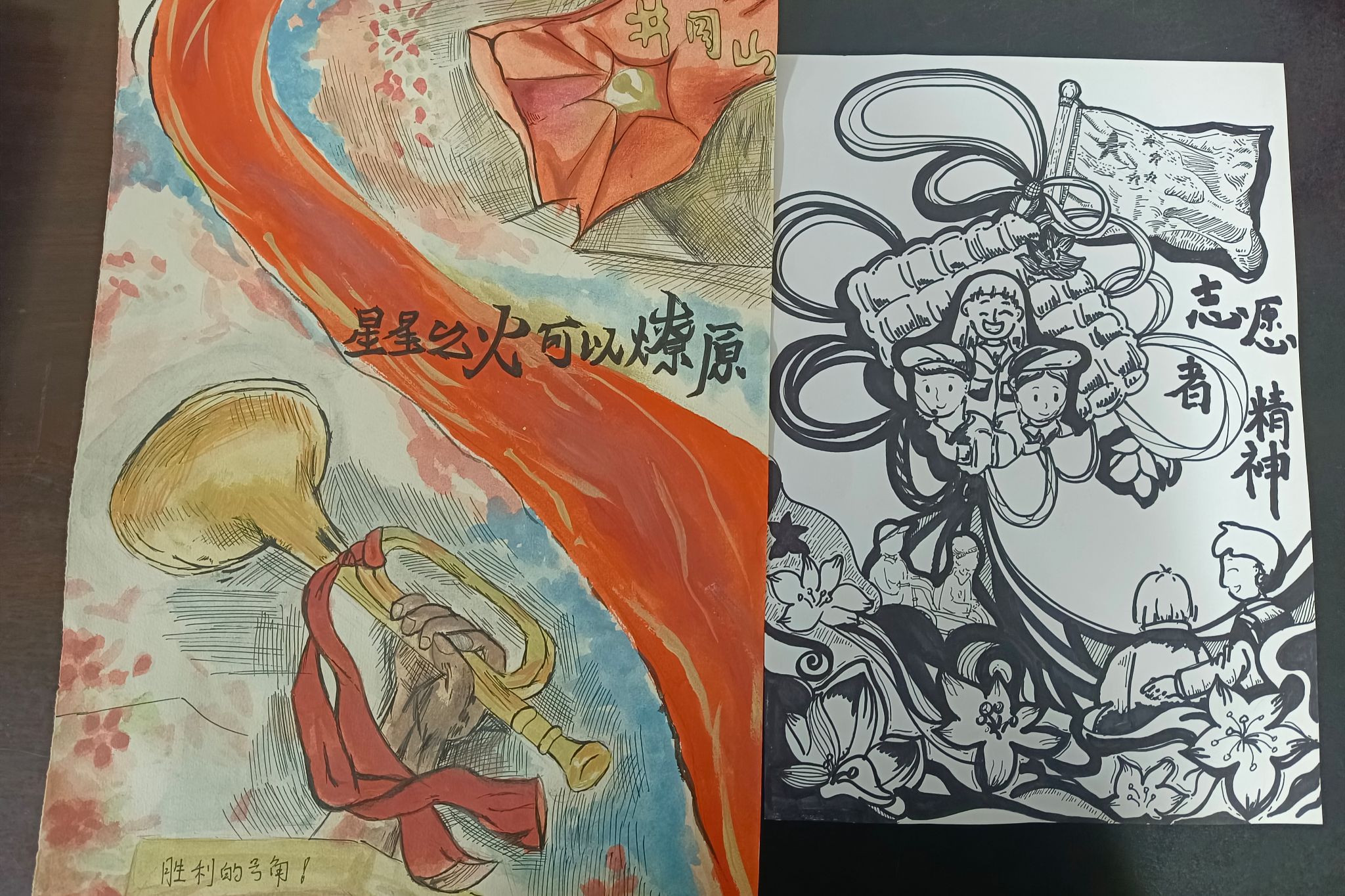 院团委青年志愿者工作部全体成员在树达楼门口展出了部分优秀参赛作品。展览涵盖书画、摄影以及诗歌创作等多元化艺术作品,生动描绘了志愿者们在不同领域的辛勤付出与无私奉献。