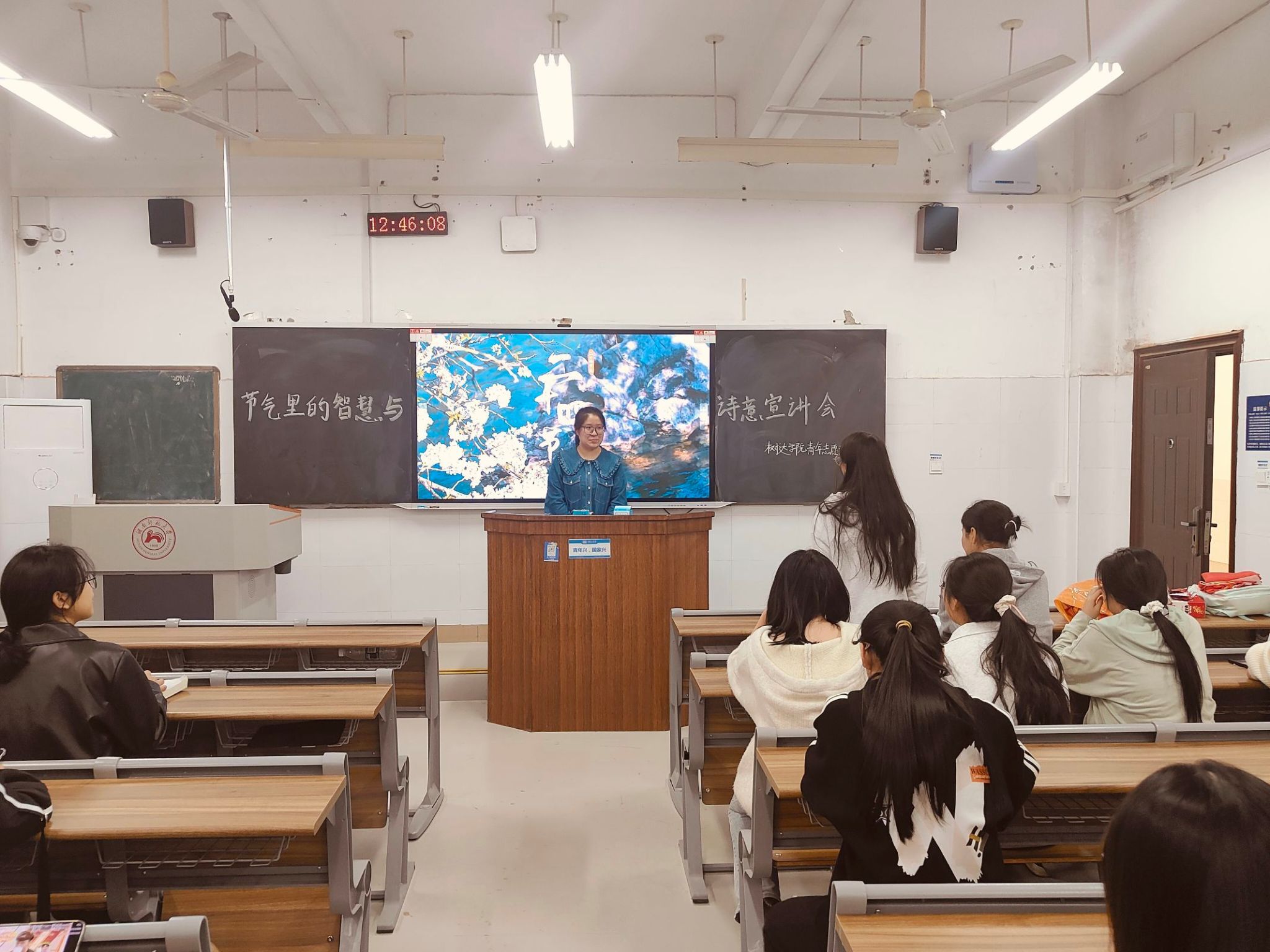 (通讯员 侯超坤 常玉好 曾婷)11月7日中午,我院院团委青年志愿者工作部在树达楼108教室开展“节气里的智慧与诗意”宣讲会志愿活动。