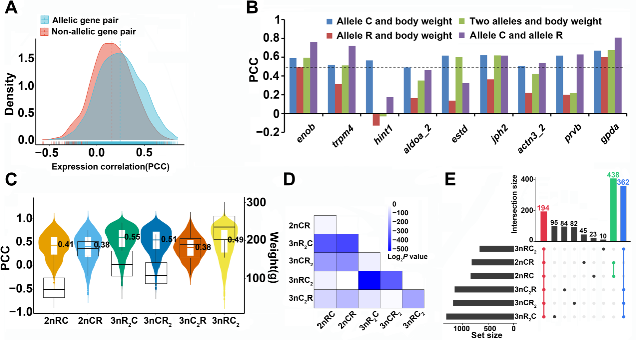 本研究通过对等位基因间以及非等位基因间的表达进行Pearson相关性系数(PCC)分析,发现杂交子代中等位基因间的表达水平更趋于一致,推测来源于鲫和鲤的共享反式调控因子使其调控的基因表达同步性增加(图4)。通过进一步对2094个生长调控基因开展等位基因间表达的相关性分析,结果显示部分基因的高PCC值与低生长速度之间存在密切关系(图4),这一发现揭示了不同物种来源的等位基因互作对生长表型的重要影响。
