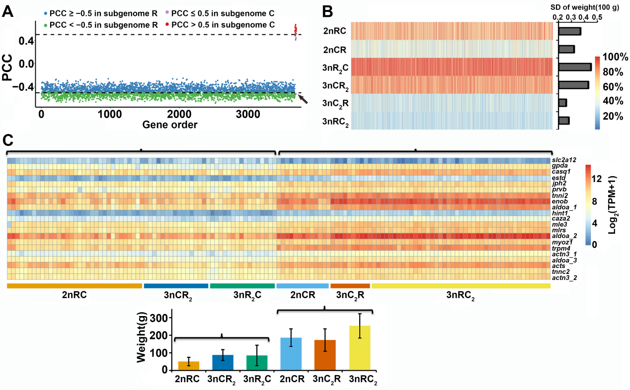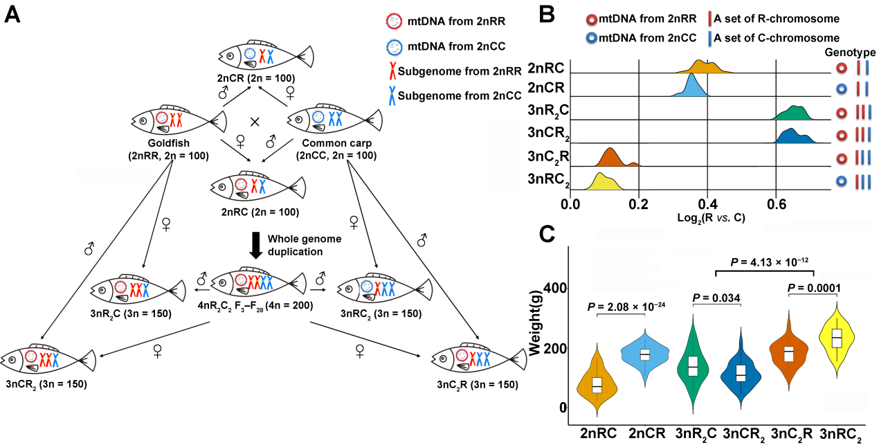 本研究通过对以上6种杂交鱼群体开展全基因组和转录组分析,发现在杂交二倍体和三倍体鱼中,具有鲤来源线粒体的个体比具有鲫来源线粒体的个体的生长速度更快(图1)。此外,在异源三倍体鱼中,具有一套鲫来源亚基因组和两套鲤来源亚基因组的鱼,比具有二套鲫来源亚基因组和一套鲤来源亚基因组的鱼,具有更快的生长速度(图1)。上述结果表明,高比例的鲤来源亚基因组和线粒体更有利于杂交鱼快速生长。