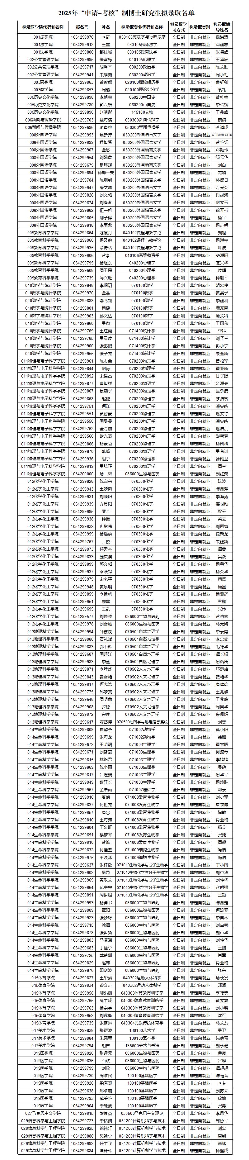 根据湖南师范大学《关于做好2025年“申请-考核”制博士研究生招生工作的通知》,现将我校2025年“申请-考核”制博士研究生拟录取名单进行网上公示,公示时间为10日。考生对拟录取公示名单如有疑问,请在公示期内向研究生院招生办公室反映(联系电话:0731-88872350)。
