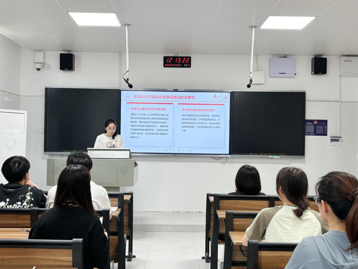 刘红艳详细阐述了党员深刻认识纪律意识和责任担当的重要性。她表示,全体党员要做到三点,一是要深入学习习近平总书记关于全面加强党的纪律建设的重要论述;二是要接受监督批评,持续自我提升;三是要用好正反两方面的典型案例。她强调,纪律是行为准则,责任担当是前行动力,各党员同志无论在校园还是社会,都要将纪律意识内化于心、外化于行。在学业上精益求精,攻克专业难题;在岗位中拼搏奋进,助力行业发展,为党和国家事业发展注入源源不断的青春力量,不负党员之名。