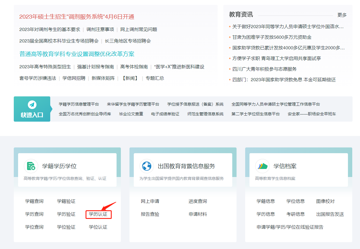 https://www.chsi.com.cn/直接进行学历认证,步骤如下:点击“学历认证”-“网上申请”-“点击进入网上申请系统(Start an Application)”,实名注册后登录系统,按系统提示上传毕业证、身份证原件,待学历认证中心审核后,打印学历认证报告。具体操作如图:
