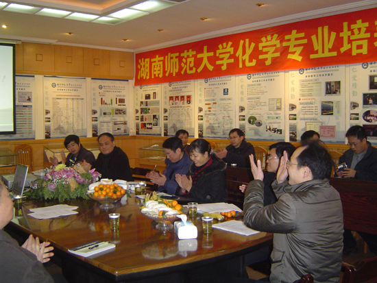 (通讯员 毛丽秋 黄元国)2009年1月3日下午,学校在化学化工学院二楼会议室举行了国家级特色专业化学本科专业人才培养方案专家论证会。专组组长由衡阳师范学院许金生教授担任,出席论证会的专家还有中南大学罗一鸣教授、湖南大学旷亚非教授、湘潭大学朱卫国教授和湖南理工学院易建明教授。教务处处长杨小云教授、化学专业负责人尹笃林教授及化学化工学院相关教师出席了论证会。
