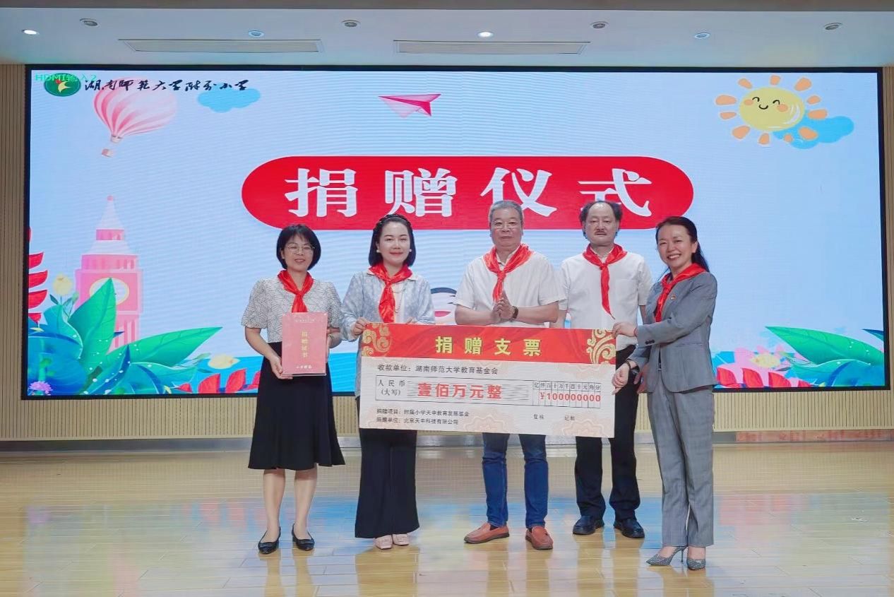 吴丹表示,她始终情系母校,特在六一儿童节到来之际,向附小捐赠100万元,支持“湖南师范大学附属小学以及李晓玲名校长工作室”组织举办“天申科技杯系列活动”。她希望孩子们能认真学习、不负韶华,德智体美劳全面发展。