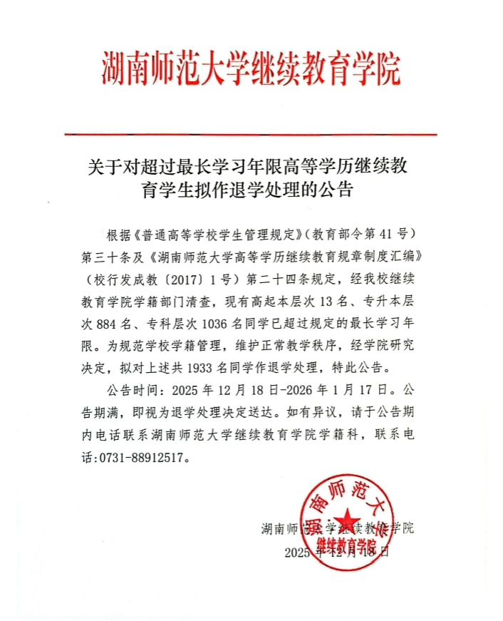 关于对超过最长学习年限高等学历继续教育学生拟作退学处理的公告